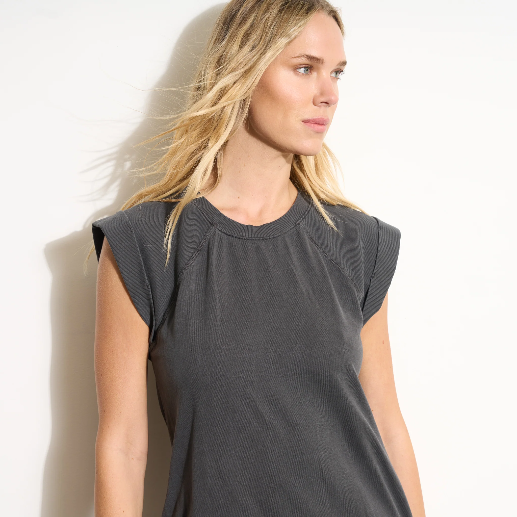 The Estelle Cap-Sleeve Raglan Heritage Dress is a California cool and easy short dress inspired by the beloved Estelle Cap-Sleeve Raglan Terry Sweatshirt. The dress features a classic crewneck, contrast rib at the cap-sleeve Raglan and neckband, on-seam pockets, muscle tank silhouette for attitude and a strong shoulder. The body is made of our heavyweight 100% American cotton Heritage jersey from the men’s 1955 Asher Standard with some stretch in the contrast rib sleeves.