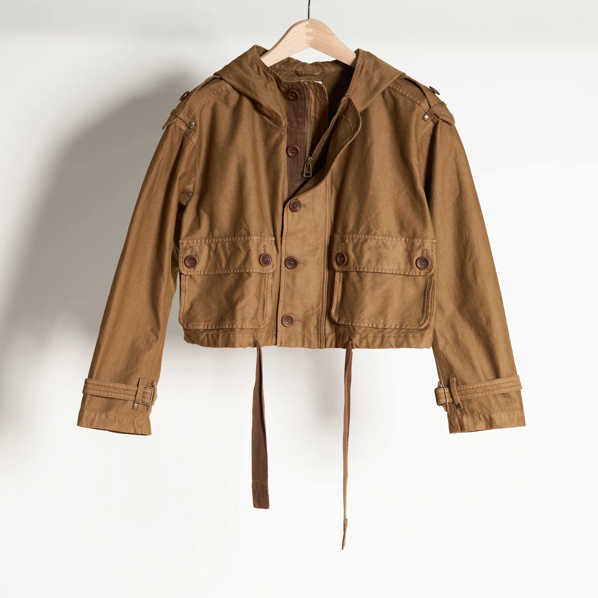 The Finnian is a showstopper, our take on a military-inspired utility coat with a high funnel neck and deep hood made from 100% Japanese sateen cotton. With an oversized yet cropped cut, it’s feminine with lots of attitude. Military details abound such as functional epaulets at the shoulders, three-dimensional patch pockets, and adjustable taps at wrists and drawstring waist for cinching.