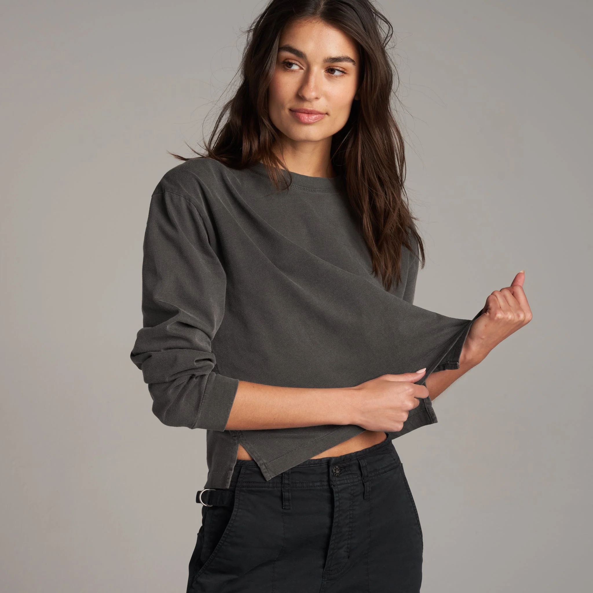 The Reagan is oversized, slouchy and easy with a loose feminine crew neck that shows off some clavicle. Slightly short cropped to the mid-waist, it’s the perfect length for untucked but long enough for a loose tuck into our Jolene denim.